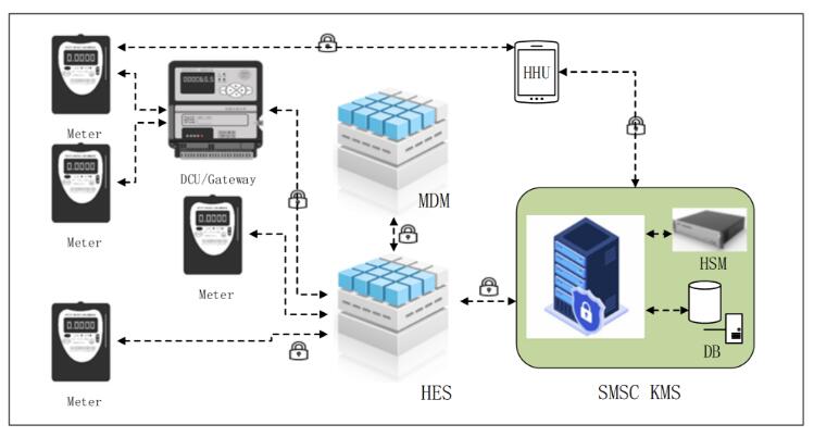 SMSC KMS(密钥管理系统, Key Management System)是一款专门面向高级智能计量系统服务领域的端到端安全整体解决方案,致力于实现系统与设备、系统与系统间高级别的安全通信保护。它提供基于租户、组、角色的设备密钥、证书保护及其生命周期的管理与维护,实现包括对称密钥、非对称密钥、认证证书等密级信息的生成、存储、分发、备份、更新、撤销、归档及恢复;另外,它提供基于国际标准算法的一系列加解密、安全校验服务,可为HES、MDM或其他三方系统与设备侧(如DCU、Gateway、Smart Meter)间认证及远程通信提供安全保护。